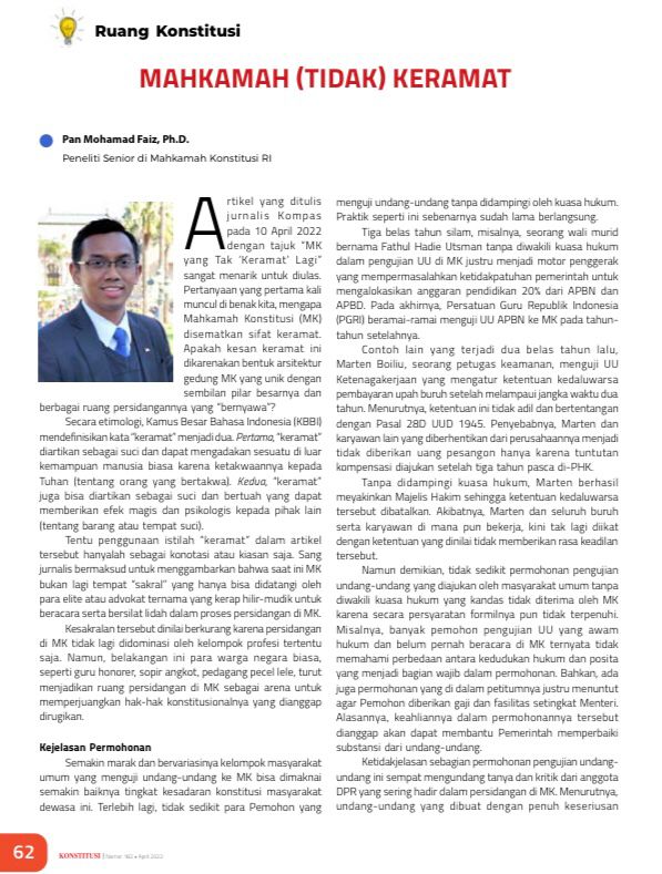 Artikel yang ditulis jurnalis Kompas pada 10 April 2022 dengan tajuk “MK yang Tak ‘Keramat’ Lagi” sangat menarik untuk diulas. Pertanyaan yang pertama kali muncul di benak kita, mengapa Mahkamah Konstitusi (MK) disematkan sifat keramat. Apakah kesan keramat ini dikarenakan bentuk arsitektur gedung MK yang unik dengan sembilan pilar besarnya dan berbagai ruang persidangannya yang “bernyawa”?