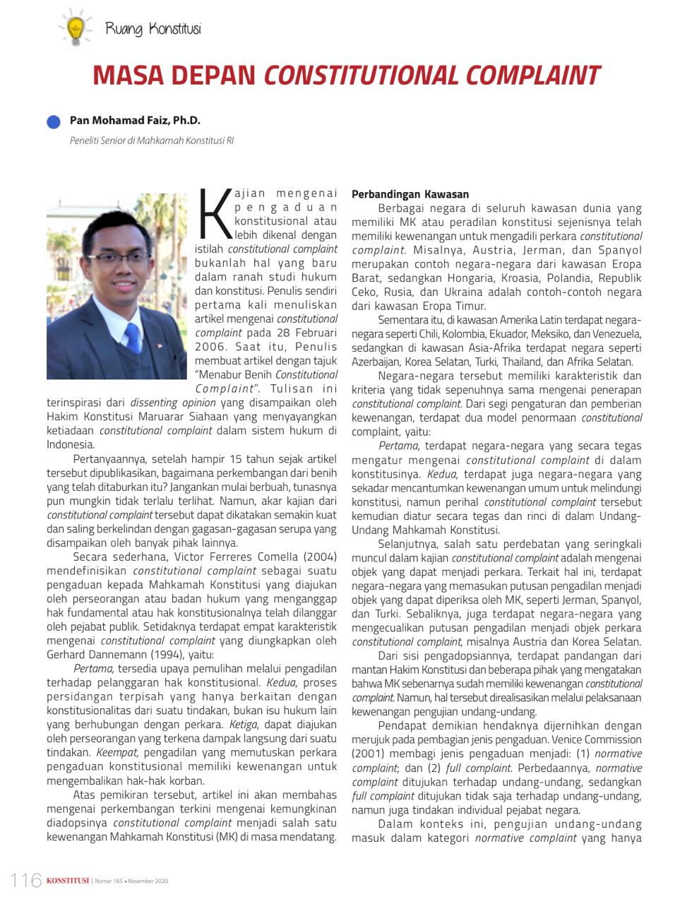 Kajian mengenai pengaduan konstitusional atau lebih dikenal dengan istilah constitutional complaint bukanlah hal yang baru dalam ranah studi hukum dan konstitusi. Penulis sendiri pertama kali menuliskan artikel mengenai constitutional complaint pada 28 Februari 2006. Saat itu, Penulis membuat artikel dengan tajuk “Menabur Benih Constitutional Complaint”. Tulisan tersebut terinspirasi dari dissenting opinion yang disampaikan oleh Hakim Konstitusi Maruarar Siahaan yang menyayangkan ketiadaan constitutional complaint dalam sistem hukum di Indonesia.