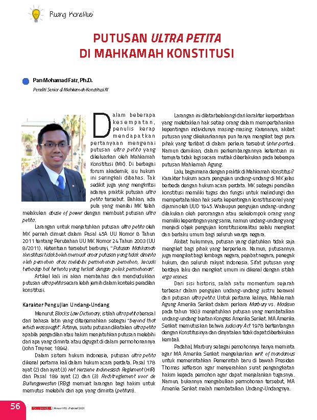 Dalam beberapa kesempatan, penulis kerap mendapatkan pertanyaan mengenai putusan ultra petita yang dikeluarkan oleh Mahkamah Konstitusi (MK). Di berbagai forum akademik, isu hukum ini seringkali dibahas. Tak sedikit juga yang mengkritisi adanya praktik putusan ultra petita tersebut. Bahkan, ada pula yang menilai MK telah melakukan abuse of power dengan membuat putusan ultra petita.